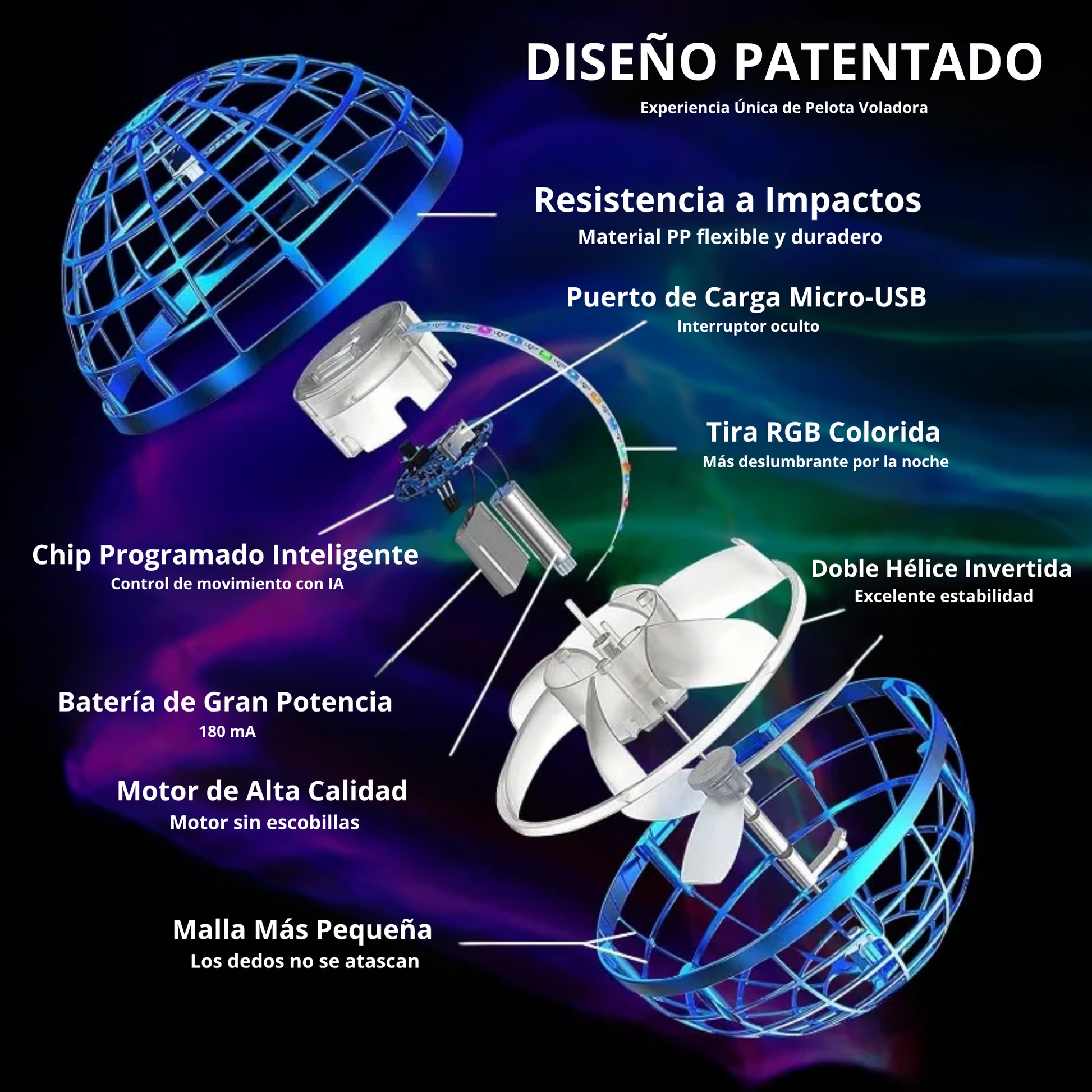 4. Atrápala con seguridad: Su diseño esférico cerrado protege tus manos y el motor interno.